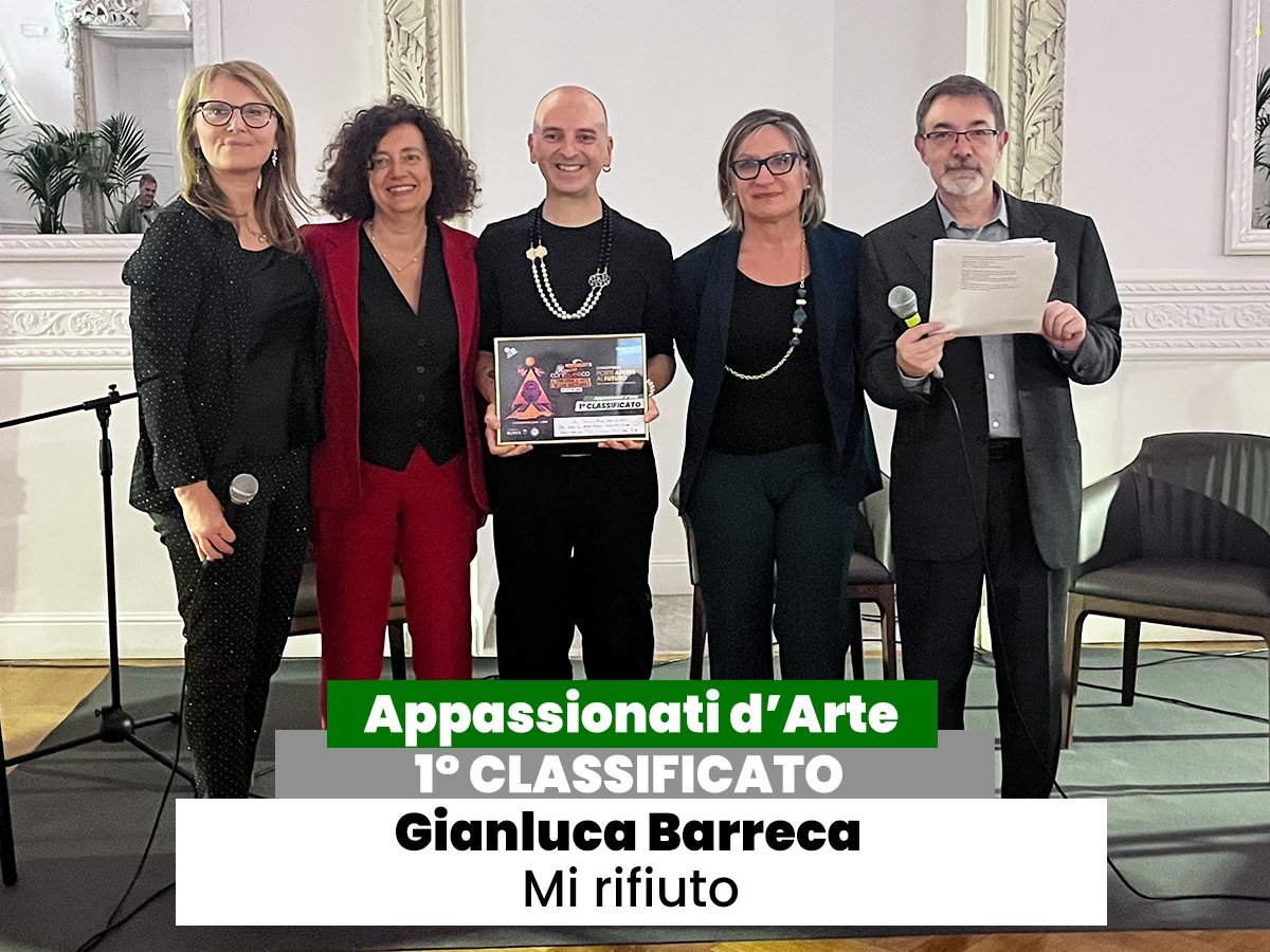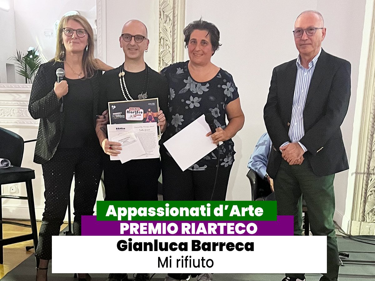 Un’installazione potente che racconta la disumanizzazione contemporanea e il bisogno di ritrovare autenticità e fragilità umana. L’opera fonde linguaggi artistici diversi in un equilibrio poetico e riflessivo. Al vincitore sono stati consegnati una targa di riconoscimento, oltre all’opportunità di partecipare al Tour RiArteco 2026 e alla mostra internazionale “Un Battito di Ciglia” presso Palazzo Rospigliosi Colonna di Zagarolo. - A Gianluca Barreca con l’opera “Mi Rifiuto” (Categoria Appassionati)